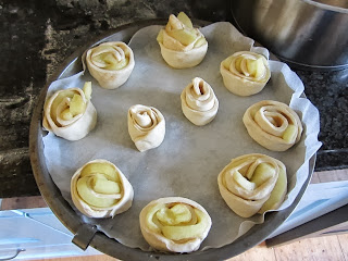 De lape dernei yn stroken snije en op sa'n strook in pear appelskiven lizze en de boel foarsichtich oprôlje. Ik ha se yn in rûn, plat bakblik setten en der noch wat sûker/kanielguod oer struit. Doe yn de ûne op sa'n 220 graden en dan sa'n 25 menuten bakke.